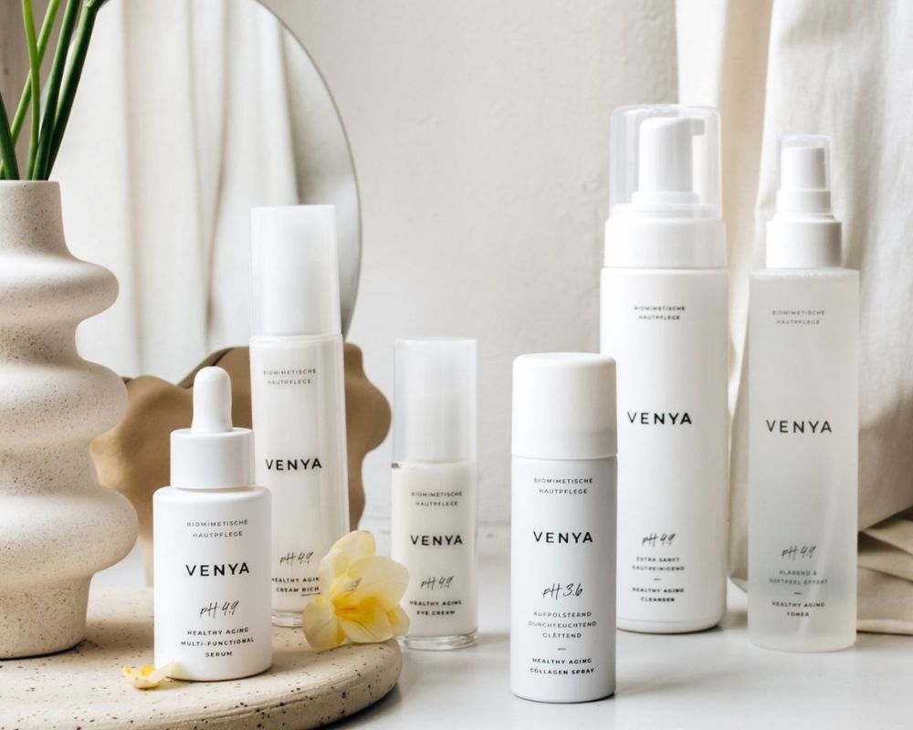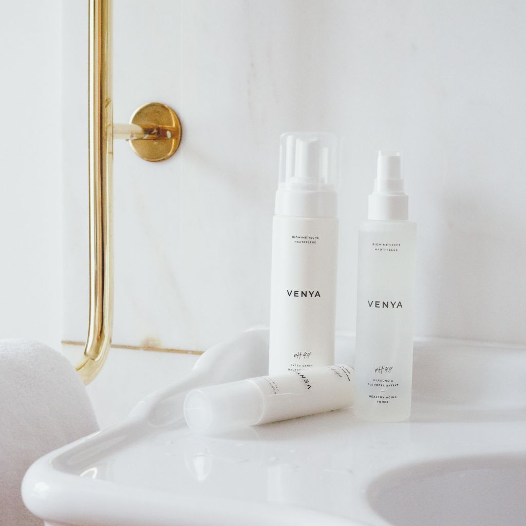 Alle VENYA Produkte bringen mit ihren biomimetischen* und pH-sauren Rezepturen die Haut zurück in ihr natürliches Gleichgewicht – denn genau das ist es, was sie für ein Healthy Aging braucht.